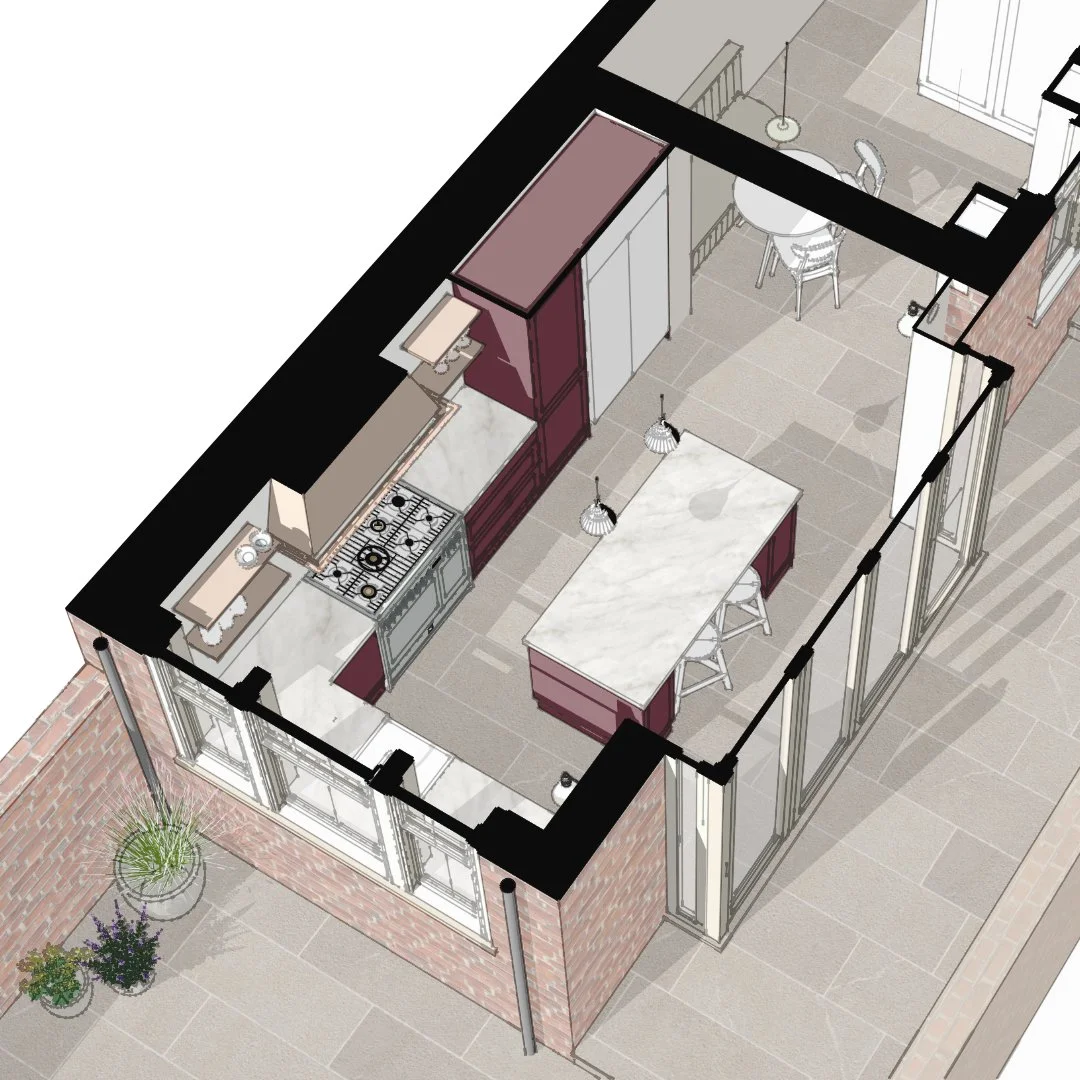 Conservation requirements and the need to retain the courtyard to the side of the extension were key planning considerations for this project. A central feature, the bay doors, project subtly to provide enough internal depth for a kitchen island without extending the footprint into the courtyard. This approach preserves valuable outdoor space, protects the historic setting, and delivers the spacious, light filled family kitchen the clients had envisioned.